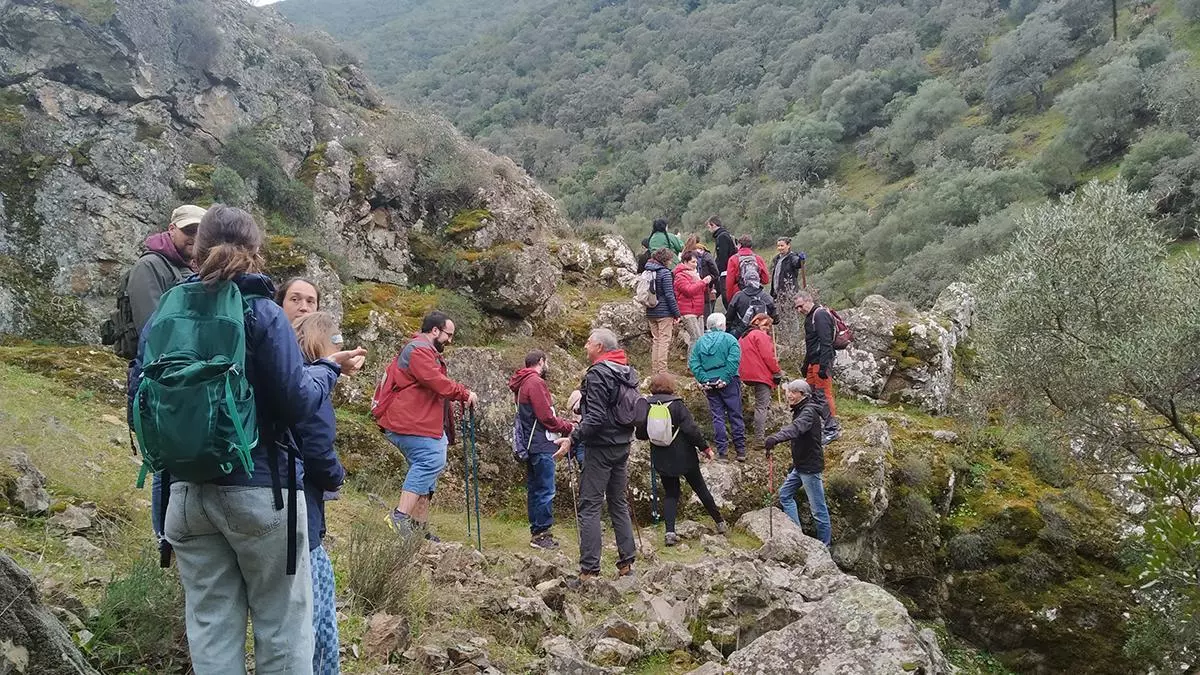 La ruta comenzó a la altura de uno de los puentes que se elevan sobre el río Guadalbarbo, a unos diez kilómetros antes de llegar al propio pueblo de Obejo, y, avanzando por las inmediaciones de su curso, pudimos disfrutar de muchos parajes y algunos rincones, de esos, que a uno le hacen decir, para sus adentros, que se pare este desquiciado tren en el que vivimos que yo me apeo aquí. Incluso llegamos a escuchar, entreverado con nuestros pasos, el murmullo del agua saltando entre las piedras. Un murmullo que parece hablarte de los misterios de su recorrido, de la tierra que ha ido preñando de futura vida, de los hocicos, picos y todo tipo de bocas cuya sed ha ido saciando, y de su cristalina transparencia, siempre que la respeten virgen y no la mancillen. Un murmullo muy diferente al que produce el agua encauzada de la urbe, como el de la despilfarrada catarata que brota de nuestros grifos para perderse, sin más, por nuestros sumideros, o el que produce nuestras siniestras tuberías mientras arrastra todos los tóxicos desechos que, antes o después, nos acabaremos tragando. Por eso resulta tan conmovedor escuchar el verdadero lenguaje del agua, porque vuelve a reconciliarte con una naturaleza a la que, por mucho que nos empeñemos, no podemos darle la espalda.