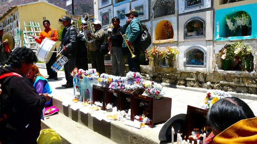 Es por esto que el primero y el segundo día de noviembre, las familias se reúnen en el cementerio para depositar alimentos y flores en las tumbas de sus fallecidos. Ofrecen estos dones a las almas de los muertos que, durante ese día, vuelven de sus montañas para convivir durante 24 horas con sus familiares y amigos. Ofrendas, música y oraciones se entremezclan en los cementerios bolivianos durante esos primeros días de noviembre.