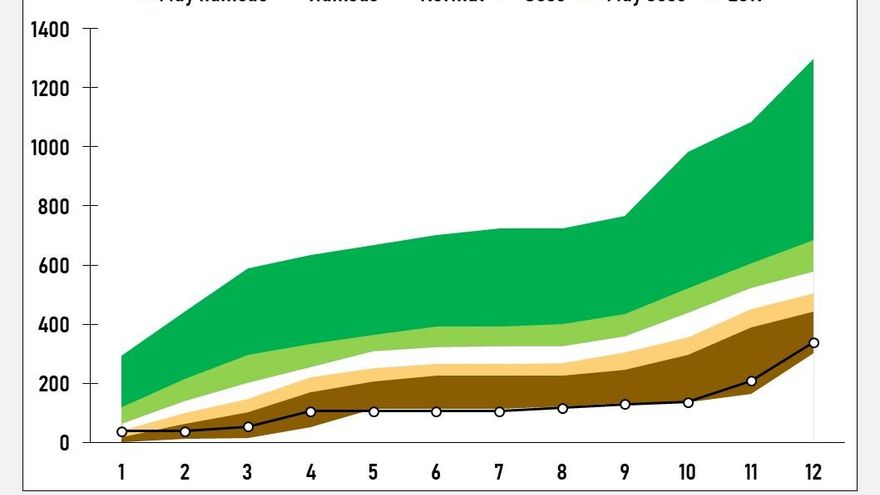 Diciembre, con 130.8 mm, fue el mes más lluvioso del año. Esto es, más de un tercio del total anual cayó en un mes. Un mes que es, históricamente, muy variable en cuanto a los acumulados: los últimos cinco diciembres sumaron 116.5 mm, menos de lo caído en 2019. Y es que diciembre de 2019 fue el diciembre más húmedo desde 2010. Junto a noviembre representó el 60 % de lo caído en todo el año.