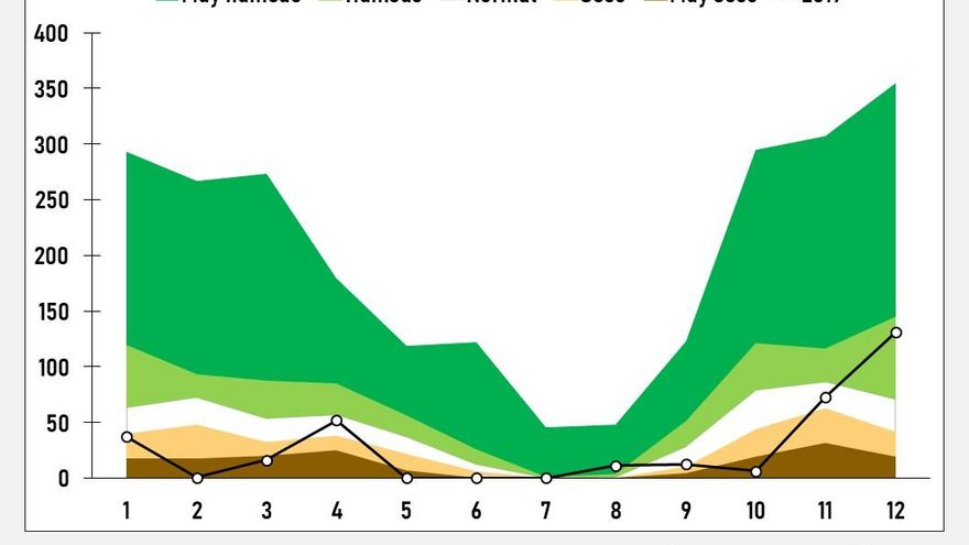 Hasta el 31 de octubre, 2019 era el segundo año más seco de enero a octubre tras 1983, con 135.7 mm. Entre noviembre y el temporal de diciembre, las lluvias sumaron 203.8 mm, 1.5 veces lo caído en los 10 meses anteriores. En total, 339.5 mm que han evitado que el año sea el más seco de todos. Una lluvia que ha representado el 57.9 % de la media 1981-2010. Es decir, 2019 ha terminado con un déficit, desde el 1 de enero, de 247 mm. Es el quinto año más seco en los registros.