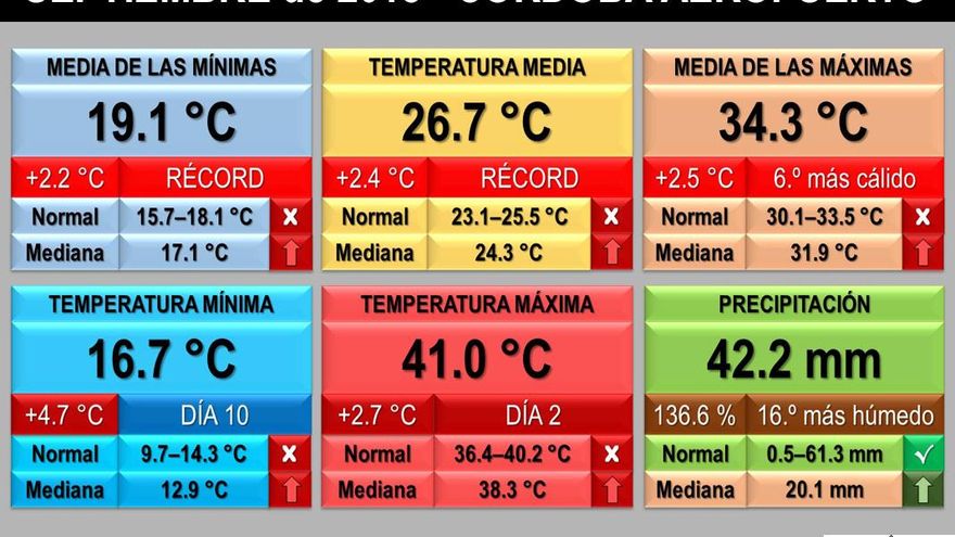 Septiembre de 2018 tuvo en Córdoba Aeropuerto una temperatura media de 26.7 °C, 2.4 °C por encima de la media del periodo 1981-2010 y récord por calor para el mes (supera a septiembre de 1985, 26.5 °C). El carácter térmico ha sido «extremadamente cálido». El mes superó también en 2.1 °C la media para los meses de septiembre desde 2001 (24.6 °C) y fue 0.8 °C más cálido que septiembre de 2016, que hasta la fecha había sido el septiembre con la media mensual más alta desde 1987.