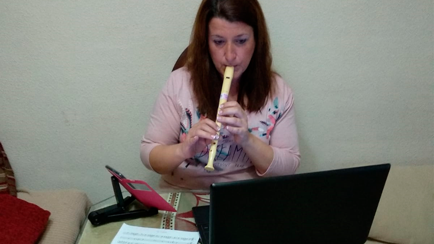 Pudieron dar la primera clase de manera presencial para enseñar el manejo de los dispositivos a los alumnos y, a partir de ahí, “cada lunes los alumnos reciben el trabajo correspondiente a las horas asignadas a la materia. Les doy un plazo razonable para realizar las tareas propuestas con la ayuda de tutoriales propios de flauta, canto, fotocopias, libro de texto, etc...Ellos van preguntando dudas en el momento que se ponen a trabajar y se las resuelvo inmediatamente”, relata, siempre que la conciliación, con las dos niñas pequeñas que tiene en casa, se lo permite.