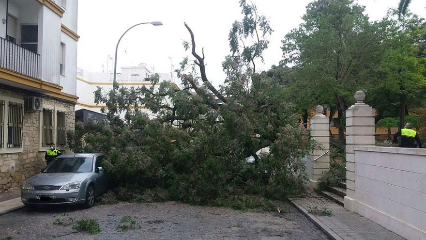 La envergadura del árbol era tal que ocupaba completamente la calle José Ortiz Sánchez, donde estaban aparcados dos coches que han quedado en medio de la trayectoria de caída.
