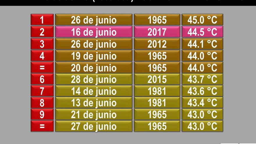 Según informa el Colectivo Meteofreak, la tarde de este viernes se ha alcanzado la segunda máxima de junio en Córdoba, y no solo desde que existe el aeropuerto. Entre 1901 y 1960, según el artículo de Antonia Roldán (AEMet) incluido en el Calendario Meteorológico de 1962, nunca se alcanzó tal temperatura en la ciudad -las estaciones estuvieron situadas en el actual instituto Góngora y luego en el actual Rectorado-.