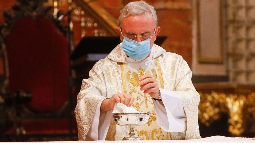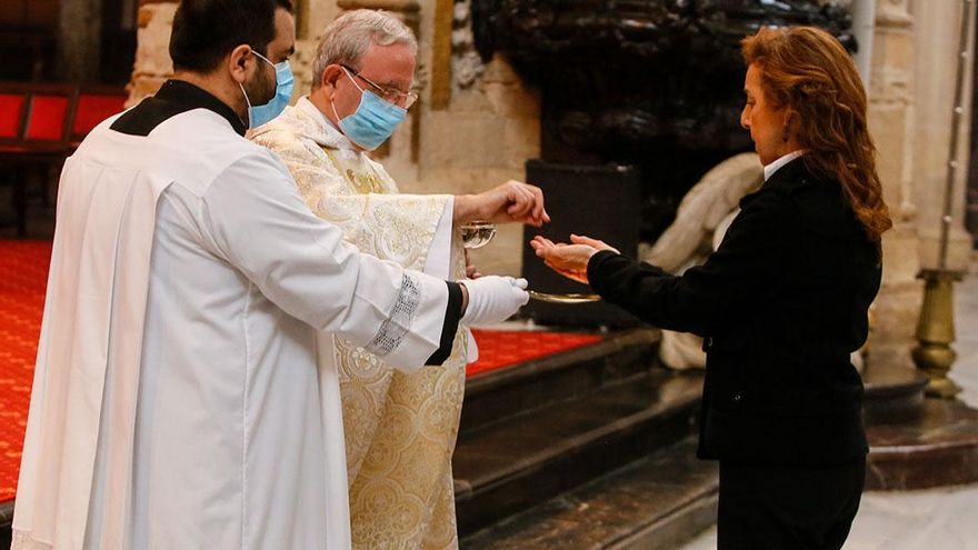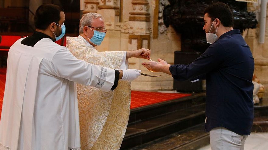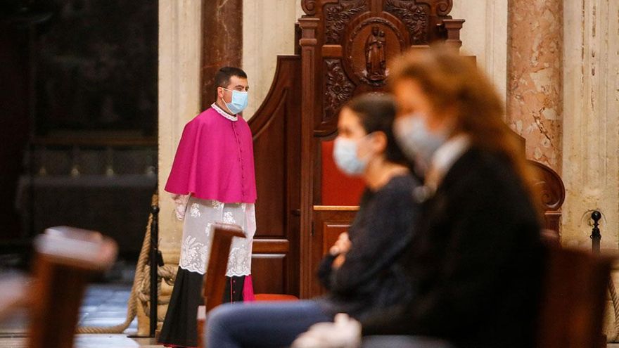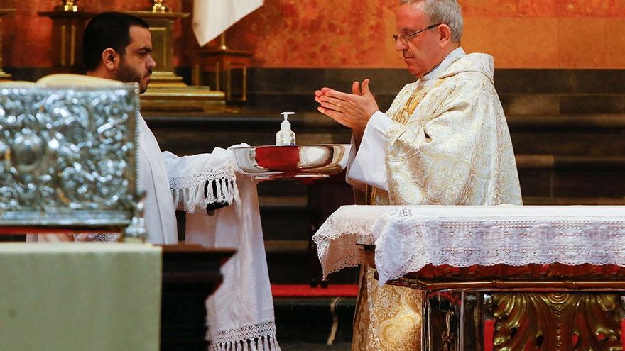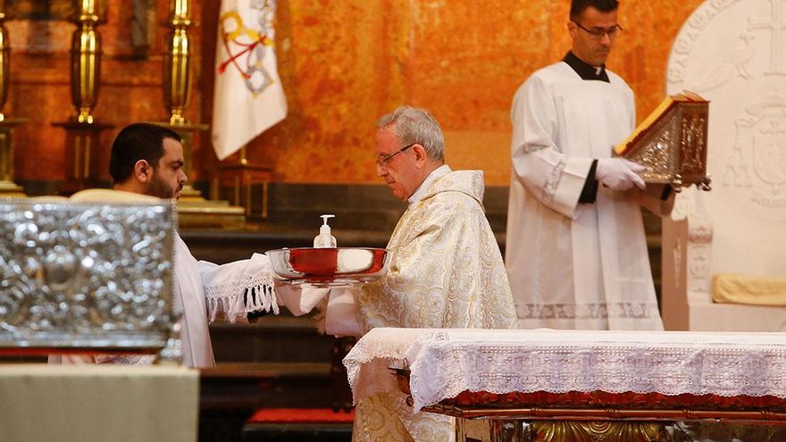 El agua bendita ha desaparecido, por el momento, de los centros de culto para evitar así posibles focos de contagio. Ya en el Altar Mayor, donde se celebra esta primera misa abierta al culto, el Cabildo ha espaciado los bancos y los feligreses se han colocado uno en cada banco. Hasta que dure la cuarentena, esta misa de las 12:00 sustituirá a la que se ofrecía a las 9:30, una liturgia que se lleva desarrollando en este monumento desde 1236. Oficiada por el deán Manuel Pérez Moya, el acto no ha contado con el coro, aunque dos personas de esta agrupación musical sí amenizan las misas durante el fin de semana.