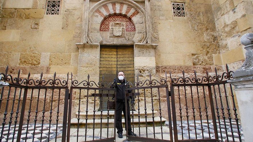 La Mezquita-Catedral de Córdoba ha reabierto este lunes únicamente al culto con la celebración de una misa a las 12:00. La Fase 1 de la desescalada que afronta ya la capital y la provincia permite que los centros de culto puedan abrir al público aunque con un tercio de su aforo. En el caso de la Mezquita-Catedral, apenas cuatro fieles han asistido a la liturgia, marcada por las medidas de higiene y seguridad impuestas por el Obispado de Córdoba.