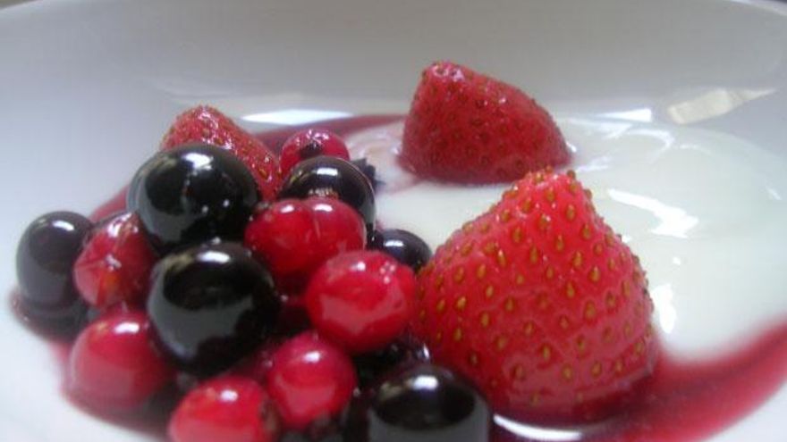 En un plato poner la mitad de un yogur griego y en la otra mitad la fruta.