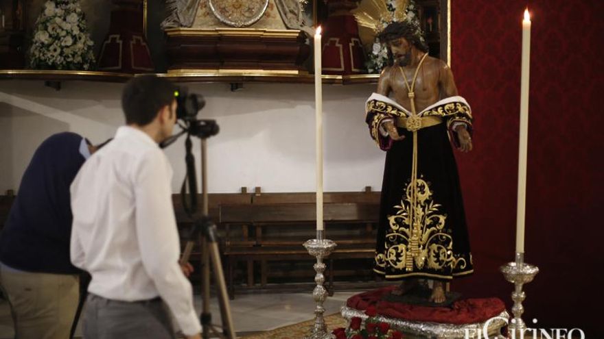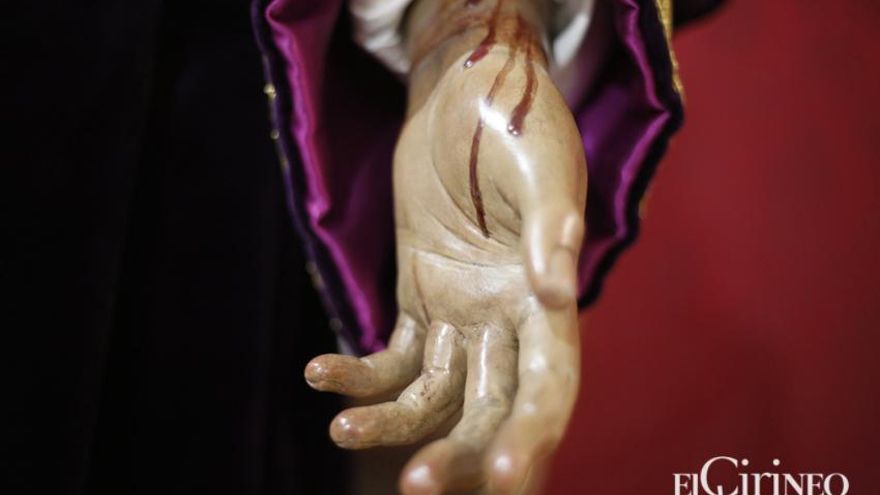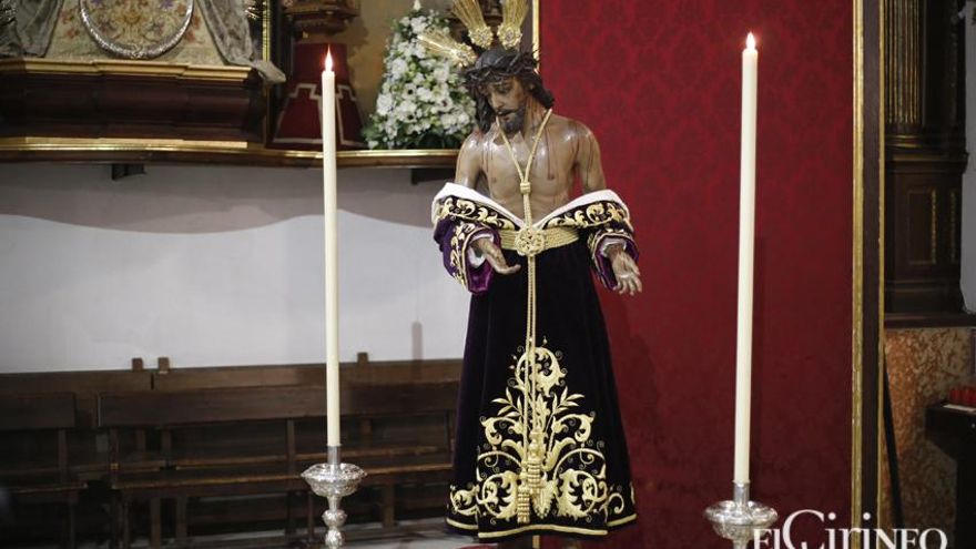 Para la ocasión, la hermandad ha decidido que el Señor aparezca vestido con su túnica morada bordada en oro pero con el detalle de llevar los dos hombros al descubierto -tradicionalmente ha mostrado solo el izquierdo- para que los fieles puedan observar mejor algunos aspectos de la intervención, como las gotas de sangre o moratones con que cuenta la imagen que han salido a la luz. De esta manera, la imagen se ha presentado a baja altura, muy cercana al suelo, con lo que la cofradía ha querido facilitar su visión.