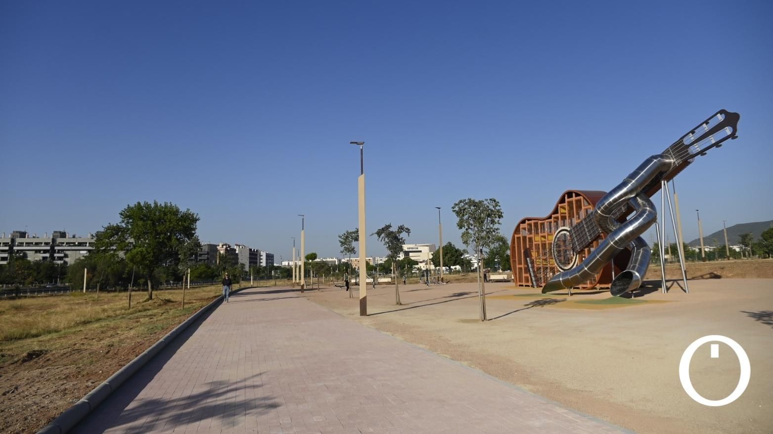 La zona oeste del Parque del Flamenco de Córdoba ha quedada inaugurada este jueves tras una inversión de unos 950.000 euros que han permitido su completa adaptación para ofrecer una gran zona verde y de entretenimiento para grandes y pequeños. Esta zona, la única que por el momento se puede usar, incluye una gran guitarra con toboganes infantiles, un área con aparatos para realizar ejercicio físico y un parque canino. Según ha estimado el alcalde de Córdoba, José María Bellido, todo el parque -que se extiende a lo largo de unos 220.000 metros cuadrados- estará listo para finales de este año.