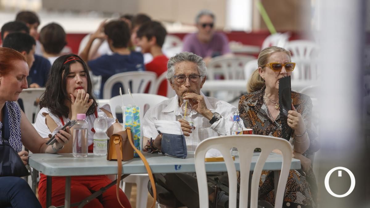 El intenso calor que se ha vivido este sábado 21 de mayo en Córdoba capital se ha dejado notar en el primer sábado de la Feria, donde quienes acudían a pasar la primera jornada de esta fiesta durante el día se han pertrechado de abanicos, bebidas frías y hasta algún paraguas haciendo de sombrilla. Las altas temperaturas no han impedido que miles de personas hayan acudido a disfrutar de la Feria este primer día sábado, donde la calima y el cielo cubierto han apaciguado durante la tarde los efectos del sol.