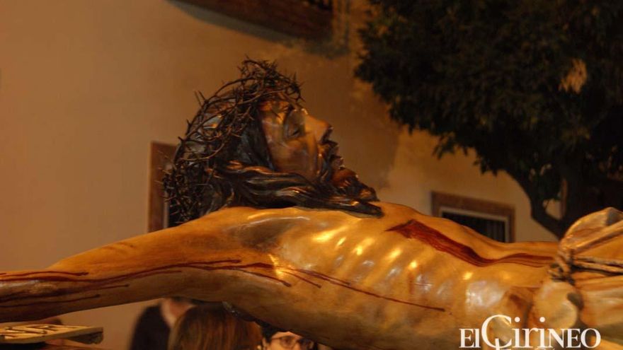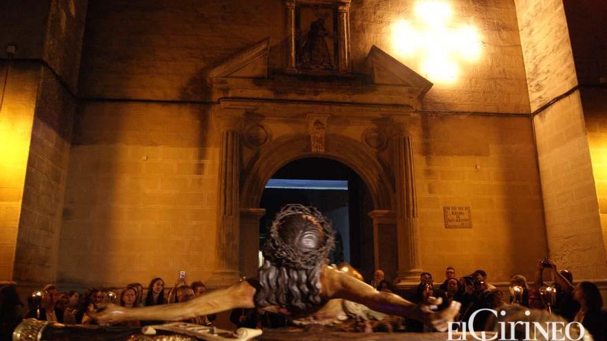 Sin duda, uno de los momentos más emotivos de la tarde noche se produjo a la llegada de la comitiva a la parroquia de San Sebastián. En este punto, la hermosa talla del Crucificado fue girada por sus hermanas cargadoras para situarse frente a la puerta principal del templo, donde permaneció cedida durante varios decenios del siglo XX. De hecho, en aquella etapa la imagen llegó a formar parte del Vía Crucis, en la madrugada del Viernes Santo, de la entonces recién creada hermandad del Santísimo Cristo de la Misericordia. Fue hasta que la corporación contó con su nuevo titular.
