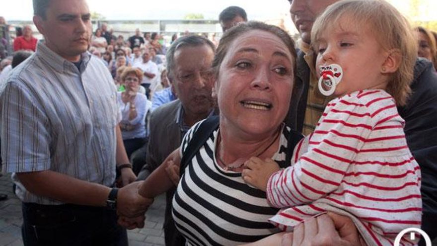 A pesar de las medidas de control, la mujer había logrado colarse en el acto de entrega de llaves. Cuando empezaron a repartirse, la mujer se levantó, se situó cerca del alcalde José Antonio Nieto y comenzó a vociferar. “Sinvergüenza, hay mucho paro, señor alcalde, mi hija no tiene vida, esta todo el día trabajando y la van echar de su casa”. Inmediatamente, los miembros de seguridad se acercaron a la mujer para contenerla. El hecho de que llevara a una niña pequeña hizo que su expulsión del lugar se prolongara un minuto. Tiempo que aprovechó para explicar a gritos su situación y su desesperación.