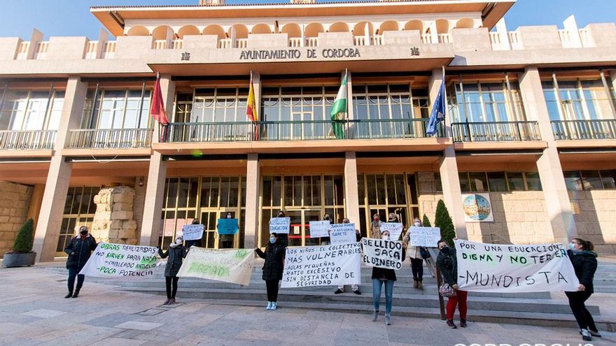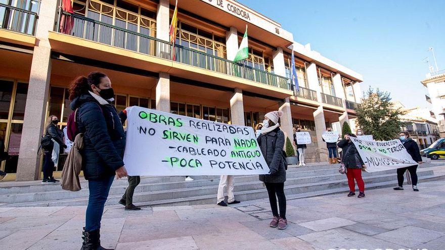 Padres y madres de alumnos del CEIP San Fernando de Córdoba se han manifestado este martes ante el Ayuntamiento de Córdoba para protestar por el frío que soportan sus hijos -y los docentes- de este centro educativo, donde hay aparatos nuevos de climatización que no se pueden poner en marcha por la falta de una instalación eléctrica que soporte su potencia, mientras la pandemia obliga a mantener las ventanas abiertas para garantizar una adecuada ventilación.