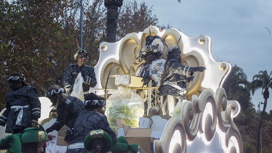Las carrozas de los reyes no tardaron en aparecer en un in crescendo , también, de lo más cinematográfico. Los vehículos de Melchor y Gaspar -funcionales, minimalistas, efectivos- servían casi como meros teloneros de la carroza realmente tochaca (pero tochaca) de la noche: la de Baltasar. Como recién salida de Tierra de Faraones (Howard Hawks, 1955) o Cleopatra (la de Joseph L. Mankiewicz , de 1963), solo le faltaba ser tirada por un centenar de esclavos a ritmo de látigo. Con cautela, se prefirió optar por un cuatro por cuatro para hacerla avanzar.