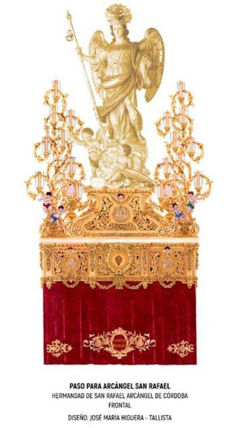 El paso va salpicado de una veintena de cartelas circulares. En ellas irá simbología, heráldica y escenas propias o cercanas a San Rafael como pueden ser la urna de los Santos Mártires, el escudo de la ciudad y de la hermandad o la aparición al Padre Roelas. La mayoría está aún por decidir y todas irán estofadas al temple. En cuanto a la iluminación, serán cuatro los candelabros de guardabrisas en las esquinas con diez puntos de luz cada uno, muy estilizados pues medirán más de dos metros de alto. En la base de los candelabros y en los laterales de la peana irán angelotes mientras que todo el conjunto lleva cabezas de querubines. Para la decoración floral se colocarán jarras a diferentes alturas.