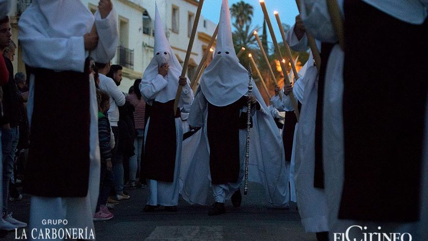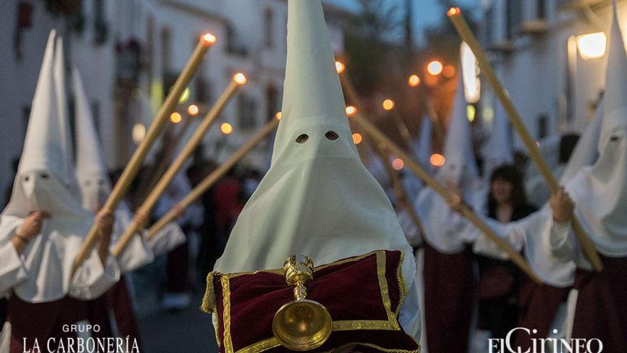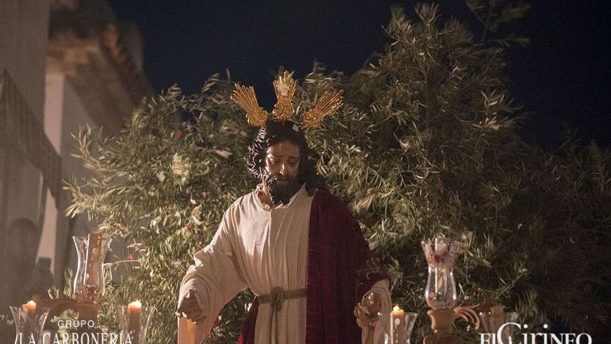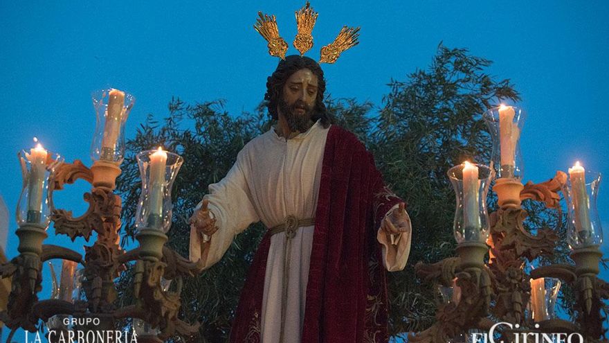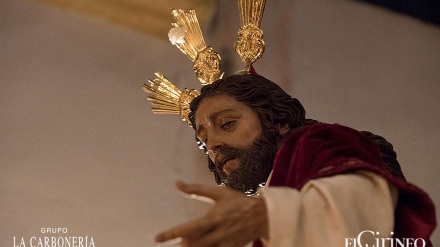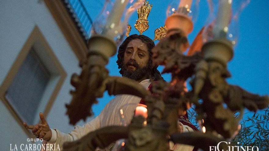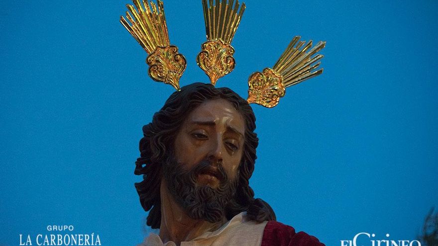 Con la batalla entre el sol y la luna, con la noche al acecho, eran muchos los que ante la parroquia de Nuestra Señora del Carmen aguardaban. A las nueve menos cuarto estaba fijado el comienzo de la procesión y a tal hora, segundos arriba o abajo, tuvo su inicio. Fue bastantes minutos después cuando Nuestro Padre Jesús de la Salud cruzó por vez primera el dintel de su templo. Bueno, por vez primera para salir, pues en junio ya lo traspasó en su traslado desde La Trinidad. La imagen que talló Manuel Luque Bonillo lució precisamente el atuendo que en aquella significativa cita. Tras él ponía su siempre grato sonido la Agrupación Musical Nuestro Padre Jesús de la Redención. Con calma pero con viveza prosiguió su trayecto el Señor, que se adentró por la calle Alfonso XII.