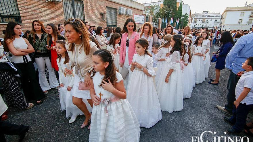 La Familia Salesiana cordobesa estaba al completo, fiel a la cita: antiguos y actuales alumnos del colegio, vestidos de Primera Comunión los que la han recibido este año y los de los primeros cursos de Primaria de angelitos; asociación de madres y padres, y salesianos cooperadores no faltaron, acompañados también por miembros de la hermandad del Prendimiento, que radica en el santuario. En último lugar, presidiendo, salía María Auxiliadora con los sones de la Banda Municipal de Mairena del Alcor, que tocaba su música por segundo año a la Virgen.