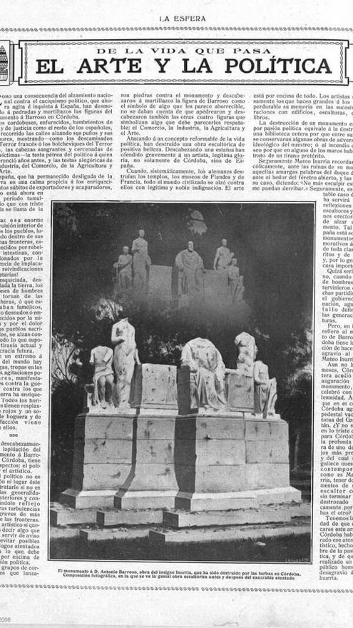 Córdoba es una ciudad de extremos. Y no hace tanto que tampoco eran muy admiradores de los políticos. Hace justo un siglo, el intelectual Rafael Castejón vio después de una gigantesca manifestación obrera cómo por el Paseo del Gran Capitán corría un grupo de chiquillos. En primera línea, uno portaba lo que al principio creyó la cabeza de un cadáver. Cuando se acercó comprobó que la testa era de piedra. Cinco meses antes, esa cabeza, esculpida nada más y nada menos que por Mateo Inurria, lucía esplendorosa sobre un conjunto de piedra instalado en los Jardines de la Agricultura. Pertenecía al ministro cordobés Antonio Barroso y Castillo, que apenas llevaba un año muerto.