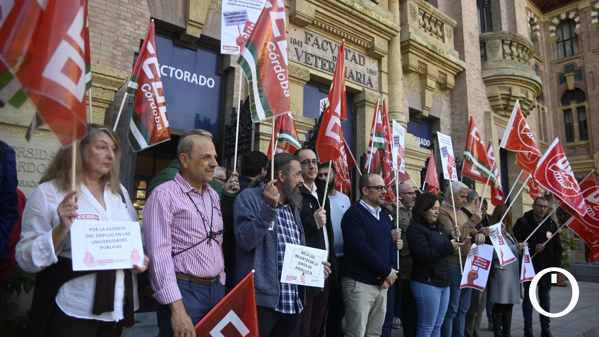 El sindicato de Enseñanza de CCOO de Córdoba y la Federación de Servicios Públicos de UGT se han concentrado este miércoles a las puertas del Rectorado de la Universidad de Córdoba para exigir a la Consejería de Universidad, Investigación e Innovación el cumplimiento de los acuerdos con el personal docente e investigador (PDI) y personal técnico de gestión, administración y servicios (PTGAS) de las universidades públicas andaluzas, que en el caso de Córdoba afecta a unas 3.000 personas.