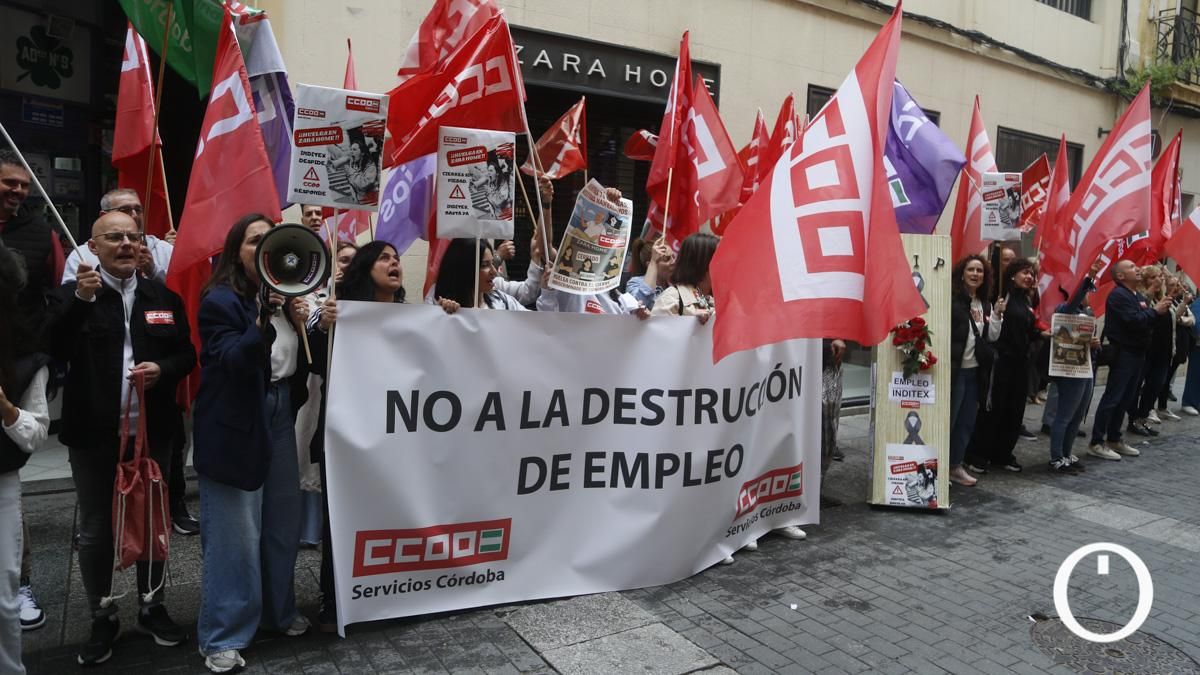 Al grito de Menos donaciones y más reubicaciones se han concentrado este lunes medio centenar de personas para exigir la reubicación de las diez trabajadoras de la tienda de Zara Home de Córdoba que perderán su empleo tras el anuncio de cierre hecho por Inditex que “en las dos reuniones del Sercla que hemos tenido solo ofrece dos reubicaciones fuera de la provincia y por ocho horas semanales”, explica la responsable de Comercio de CCOO de Córdoba, María José Merino.