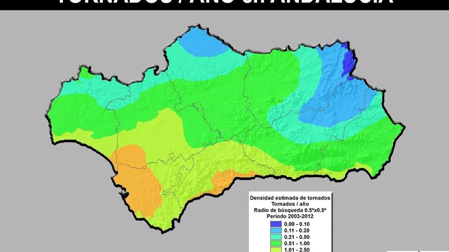 3.ª. La zona con mayor densidad (0.5-1 tornados/año) corresponde al valle del Guadalquivir y la Subbética. El periodo medio de ocurrencia se situaría entre uno y dos años.