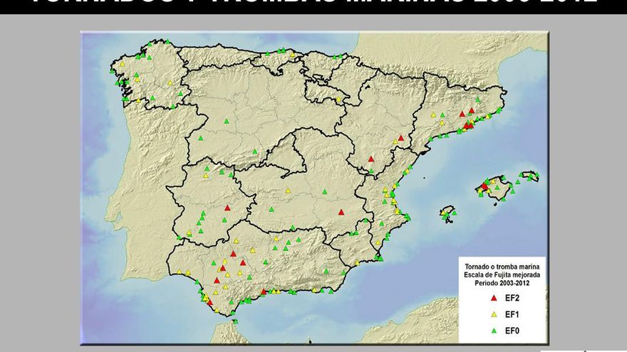 De 2003 a 2012 hubo 224 tornados en España, es decir, unos 22 de media al año. De ellos, 138 fueron en tierra y 86 en el mar (trombas marinas). La mayoría ocurrió en las horas centrales del día, a partir de mediodía y hasta el anochecer, durante el final del verano, el otoño y principios del invierno. Ninguno de esos 224 tornados alcanzó la categoría EF3, con un 70 % de categoría EF0 y solo un 7 % de categoría EF2 (Riesco et al., 2015).