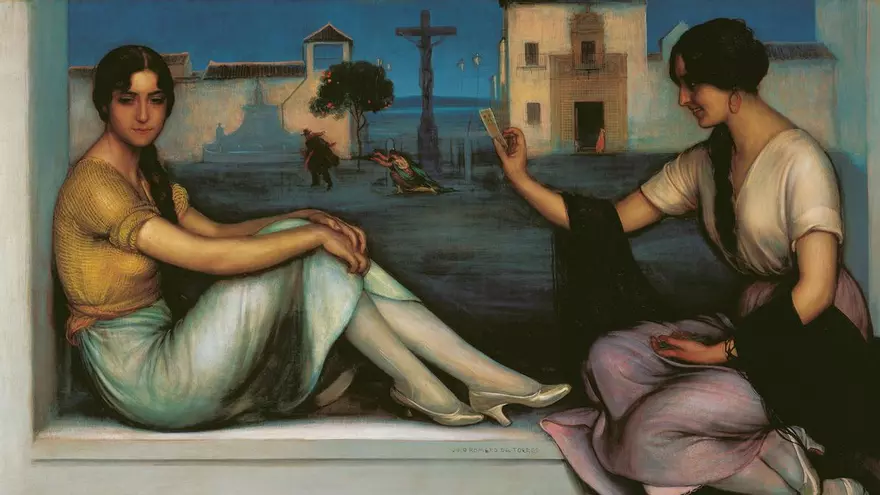 Así, entre obras de Ramón Casas, Sorolla y Francisco de Zurbarán, brilla La buenaventura, un cuadro que, según explica la hoja de sala, evidencia lo trágico del amor romántico. “Una mujer en primer plano muestra su tristeza por un desamor sufrido, un estado de melancolía que contrasta con la misteriosa sonrisa de la echadora de cartas. En segundo plano, una escena que, en un salto temporal cinematográfico, nos muestra la imagen del trágico abandono, en una Córdoba inventada pero reconocible que se compone como escenario mágico justo antes del anochecer”, explican en el Thyssen sobre la obra.