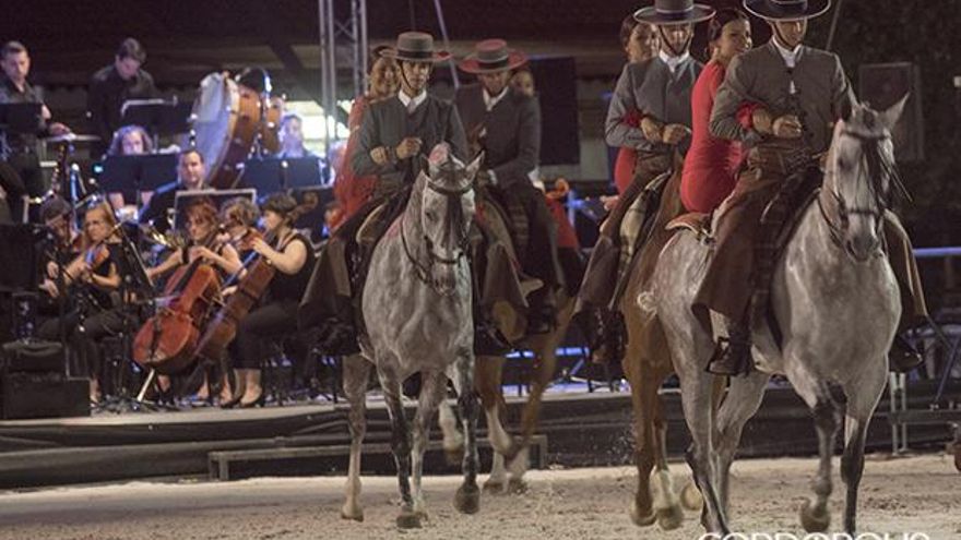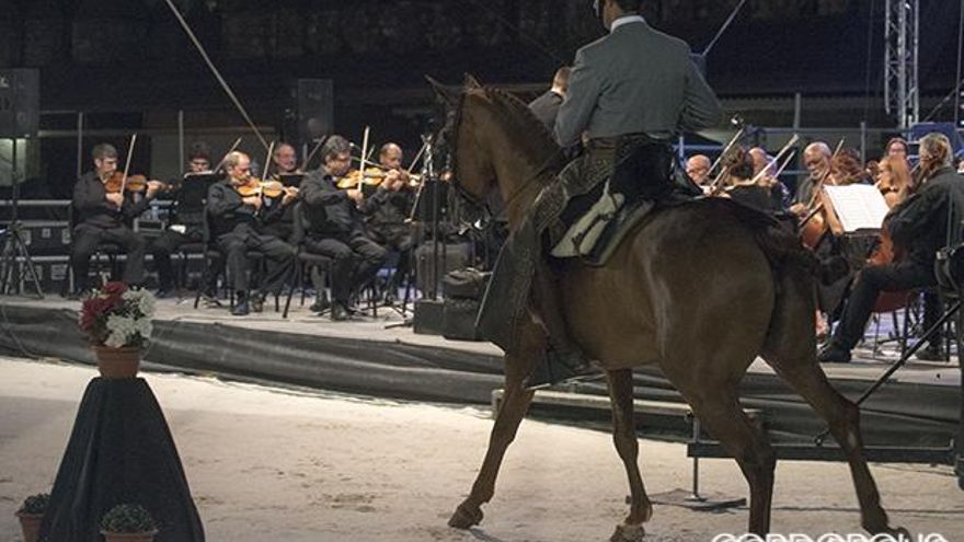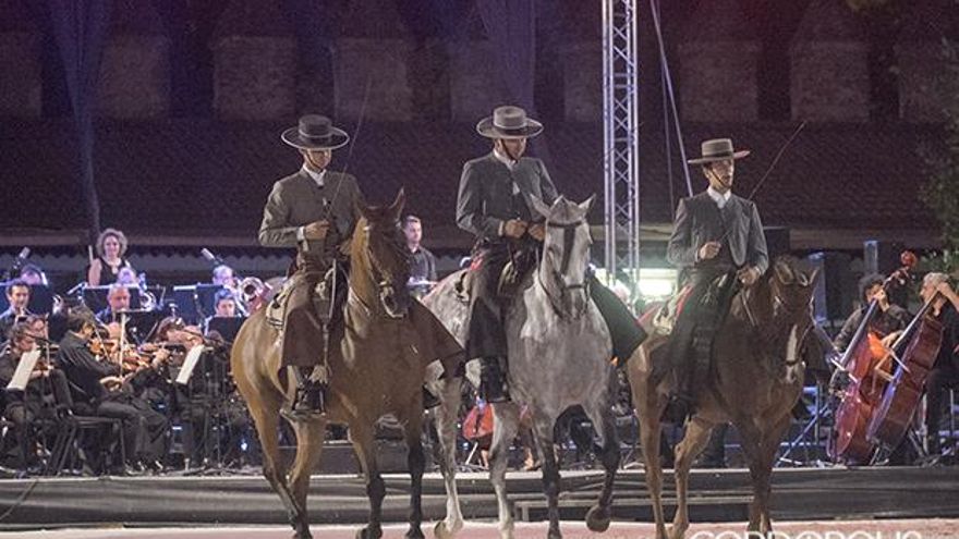 Un total de ocho jinetes, 36 caballos y cuatro coches del Club de Carruajes de Tradición se pusieron en las manos de los 52 músicos componentes de esta Orquesta, que interpretaron piezas de Bretón, Chapí, Giménez, Chueca, de la Carmen de Bizet y Strauss padre e hijo, en memoria de la Escuela Española de Equitación de Viena. Sin duda, una iniciativa que ha conseguido hacer de la disciplina un arte, apostando por el turismo cordobés al combinar dos polos muy importantes: la melodía sinfónica y el arte propio del caballo andaluz.