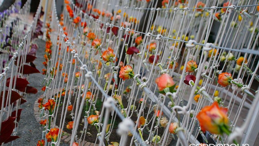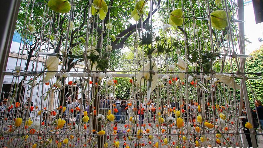Siguiendo el recorrido, el Patio de la Capilla del Palacio de Viana espera al visitante. Aquí un Campo estático creado por el colectivo tailandés PHKA -un estudio multidisciplinar formado por quince miembros que trata de establecer un puente entre el diseño de espacios y las instalaciones florales y botánicas-, inunda este patio que se estrena en Flora. A través de estructuras con 2.400 metros de cuerda y más de 960 nudos, recrean el viaje de las flores y las plantas, la vida de las plantas. Hileras cromáticas del verde al amarillo, pasando por el naranja, rosas y morados muestran la posición de una misma planta desde su nacimiento hasta su plenitud. Muestran al público un arco del tiempo, la evolución de la vida de las plantas hasta su esplendor.
