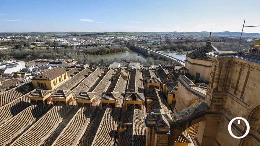 Desde los andamios del Mihrab, las cubiertas de la Mezquita Catedral de Córdoba ofrecen una vista imponente al río Guadalquivir y su feraz campiña. Su muro sur, la qibla sobre la que oraban los musulmanes, es mucho más elevado que el norte, que da al Patio de los Naranjos. La sensación de vértigo es mucho mayor y también comprensible un acceso muy restringido y regulado, pero sobre un sistema de mantenimiento muy ideado que no tiene mayor problema.