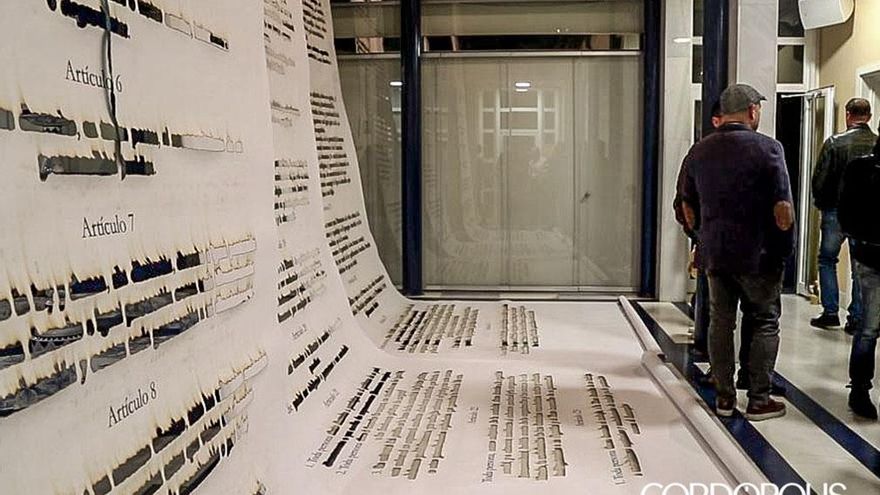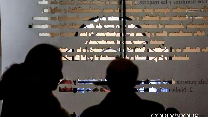 Es una definición inicial de lo que uno se encuentra en Toda persona. Nadie, la instalación que ha creado Nieves Galiot para celebrar el 250 aniversario del Colegio de Abogados de Córdoba, y que también servirá para celebrar, el 10 de diciembre, el día internacional de los derechos humanos. Todo a partir de treinta artículos de una declaración en los que solo permanecen legibles algunas cuantas palabras.