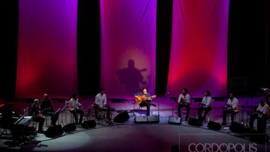Vicente Amigo lo advirtió en los días previos: “Tocar en Córdoba da respeto. Aquí me ven ir en bici”. El guitarrista acabó pronto con ese miedo respetuoso y se metió rápido al público en el bolsillo en el que será su único concierto en España. Por eso, Amigo se trajo a Córdoba a todos los músicos que han pulido 'Tierra': Guy Fletcher (productor y teclados) quien fuese teclista de Dire Straits y colaborador inseparable de Mark Knopfler, Danny Cummings percusión, batería), el violinista John McCusker, Donald Shaw (acordeón) y Ewen Vernal (contrabajo). Junto a ellos, sus habituales: Paquito González (cajón), Rafael de Utrera (cante) y Añil Fernández (segunda guitarra).