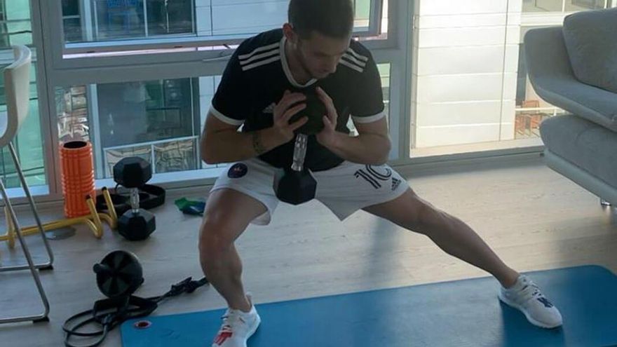 R. Entrenando en casa. El club nos trae material, comida, proteínas... un poco de todo para mantenernos en la línea. Es lógico que pierdas algo de ritmo porque no juegas, pero tenemos todo lo posible.