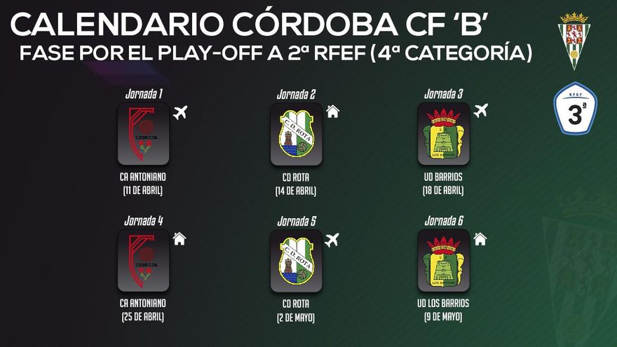 Repasada la disposición en la tabla al comienzo de la segunda fase no está de más hacer lo propio con el calendario. Cabe recordar que cada equipo se mide, en doble duelo, a los tres rivales inéditos hasta la fecha: esto es ante los tres procedentes del otro subgrupo. Por tanto, el Córdoba B y el Pozoblanco han de verse las caras con los mencionados Los Barrios, Rota y Antoniano, que son los clubes procedentes del X-A. Los blanquiverdes arrancan el domingo a las 12:30 con visita al tercero de los adversarios referidos recientemente, mientras que los blanquillos lo hacen también como foráneos ante el primero de los contrincantes citados. Aunque en el caso de la escuadra dirigida por Emilio Fajardo el partido se disputa el sábado a las 18:00. La pugna va a resultar compleja desde el principio, por otro lado, al haber, nada más y nada menos, tres choques en siete días -con el 14 y el 18 de abril como fechas centrales de la segunda y tercera jornada-. A todo esto, no se produce descanso en ningún fin de semana en esta competición, de forma que acaba el 9 de mayo.