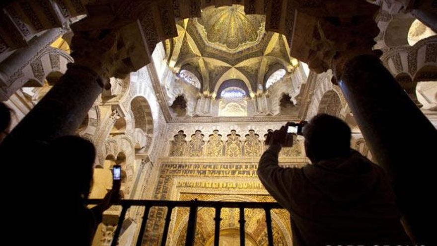 Una pista: Hay quien juega frente al mihrab, tras la reja que lo protege, a buscar la cara del califa entre los mosaicos. Es cierto que se ve, pero solo está en la inteligencia visual de cada uno y no es más es un juego de imágenes. Un califa que, por cierto, se parece más a Julio Anguita que a Alhakén.