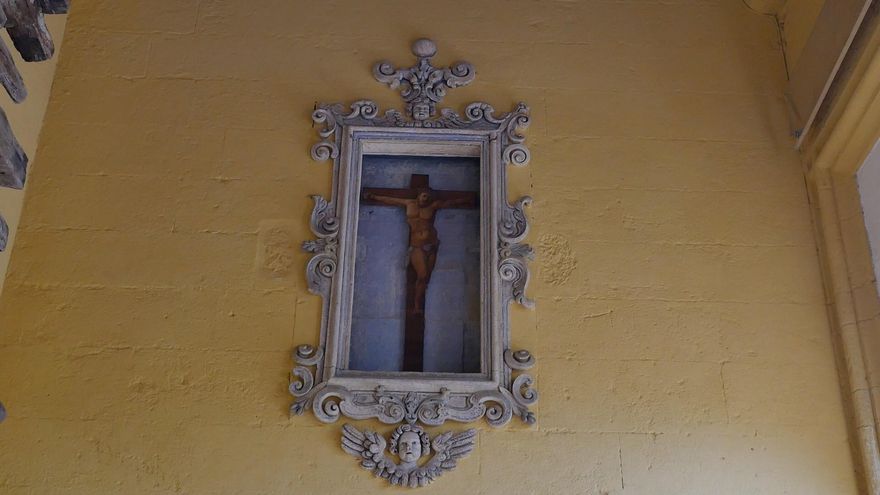 Por último, la tercera pista nos lleva a buscar en la zona porticada y es una pintura contemporánea, la única con calidad digna de todas las de esta época que guarda la Mezquita. En el año 1983 se colocó un crucificado de Guillermo Pérez Villata dentro de una hornacina barroca de 1671. La obra fue encargada por Los Gabrieles -Ruiz cabrero y Rebollo, arquitectos conservadores del templo desde el inicio de la Democracia- en aplicación del precepto legal de destinar el 1% del presupuesto de las obras oficiales a una finalidad cultural. Naturalmente, el Cabildo mostró cierta reticencia al principio con un artista que reniega de la otra vida y cuyo deseo de creación no es otro que “intentar que este valle de lágrimas sea un jardín de placer”. Pero, finalmente, la pintura se colocó en su sitio y allí permanece, algo escondida.
