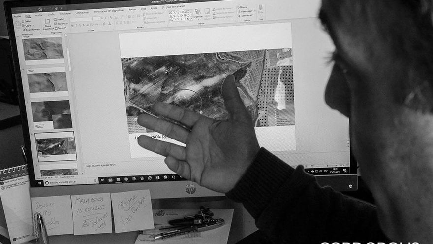 R. No, no. Buscando en Google Maps no. España cuenta con el sistema de datos abiertos más avanzado, datos geográficos me refiero, de Europa occidental. Yo creo que en Italia todavía hay que solicitar los planos. En Francia también... Y entonces el Instituto Geográfico Nacional junto con las comunidades hace ortofotos todos los años. Pero sobre todo hizo un vuelo Lidar, un vuelo láser, escaneando todo el terreno y escaneando el microterreno. Bueno, pues esto es fácil. [Muestra su trabajo en la pantalla del ordenador]. Te vas al PNOA y yo estuve atento a la actualización de los archivos. Cuando me enteré de que se habían actualizado los del terreno y los del microterreno me fui enseguida a buscar. Encontré más cosas, pero el anfiteatro era lo más interesante. Y entonces, pues trasteando un poco por los archivos se veía ese ovalito aquí al lado de la puerta y poquito a poquito, comparando y viendo cosas, me fui a la ortofoto. Quiero decir, que fue una cuestión de actualidad, de saber manejar este tipo de tecnología. No sé quién me decía el otro día que los países que tienen la información en datos abiertos generaban un 12 por ciento más de actividad de la que hubieran podido hacer si los datos estuvieran cerrados. Hay una enorme cantidad de yacimientos en España que hoy día se pueden poner en carga gracias a que tenemos este sistema de datos en abierto del Ministerio. Es que el anfiteatro de Torreparedones salió en este ordenador. Trasteando en el portal del PNOA. Luego ha habido más cosas hasta que se excavó. Pero sí, salió aquí en este despacho. No es arqueología de salón ni de despacho. Simplemente intentar conjugar lo que vemos en el terreno con lo que hoy día puedes ver con estas cosas.