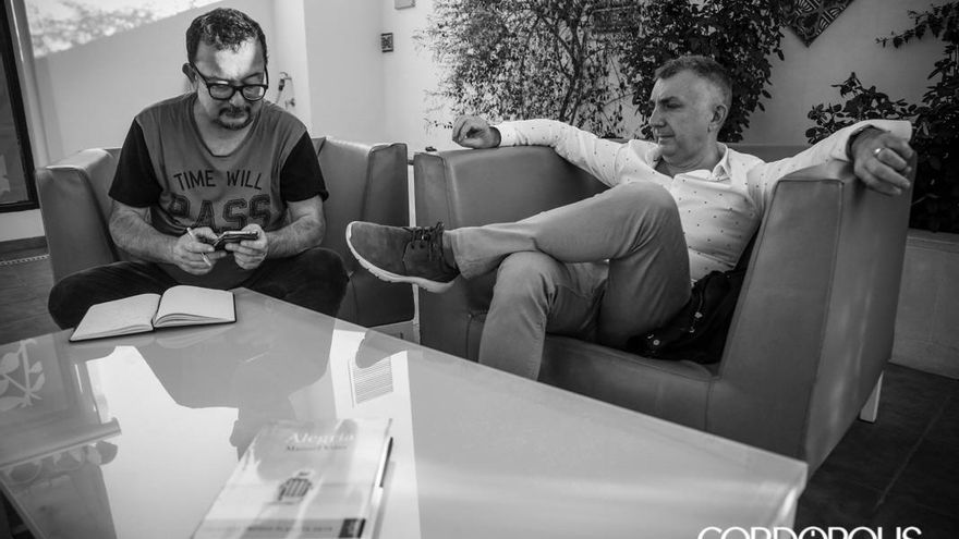 Paseamos brevemente con Manuel Vilas (Barbastro, Huesca, 1962) por la Plaza de Capuchinos y el Bailío. Se hospeda cerca, en un hotel que antes fue una pastelería mítica. Le decimos al Gran Vilas que está “en territorio Cántico”, que en una calle cercana vivía Pablo García Baena y paseaba por aquí con las manos cruzadas a la espalda hasta el final.